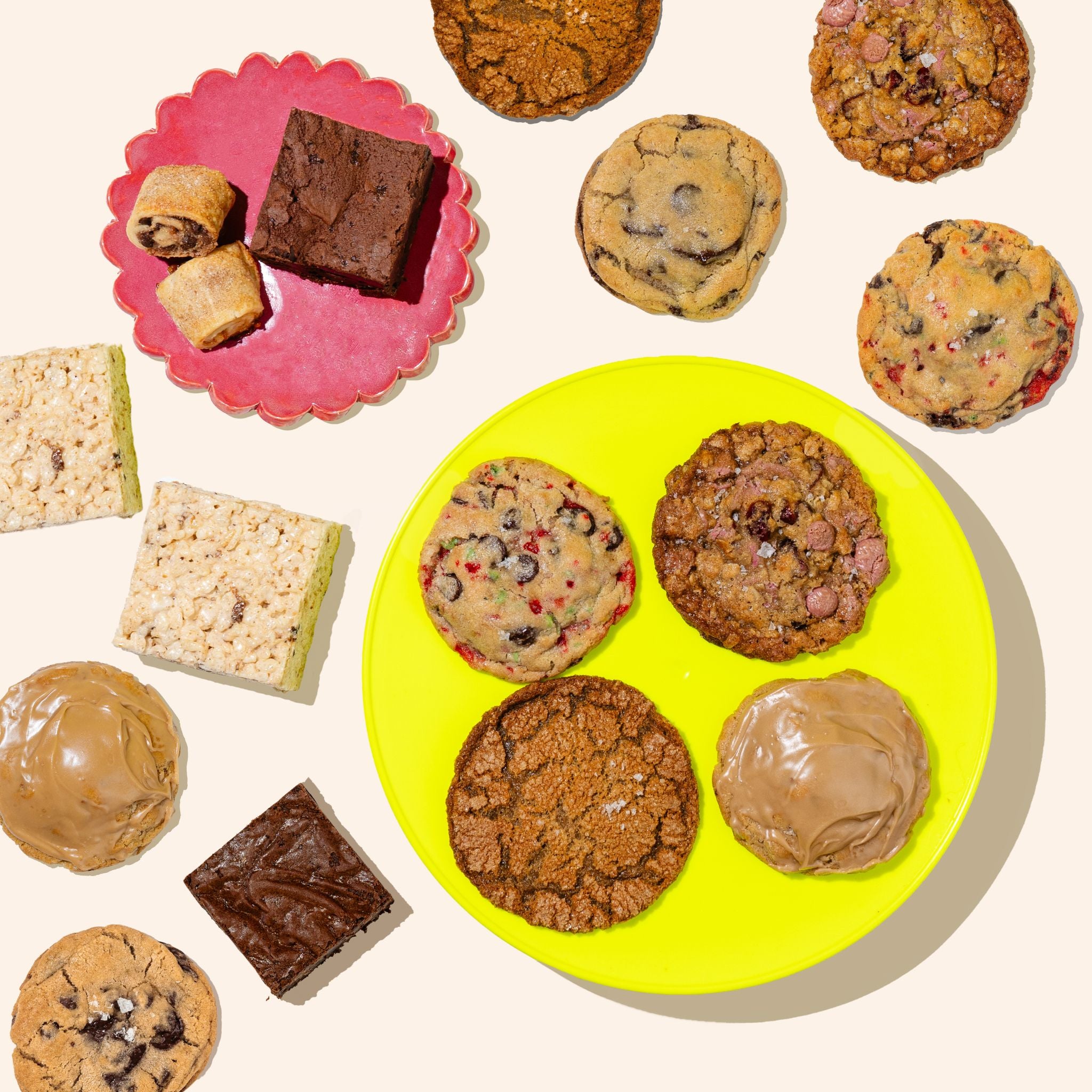 • colorful plates with assorted holiday cookies on display