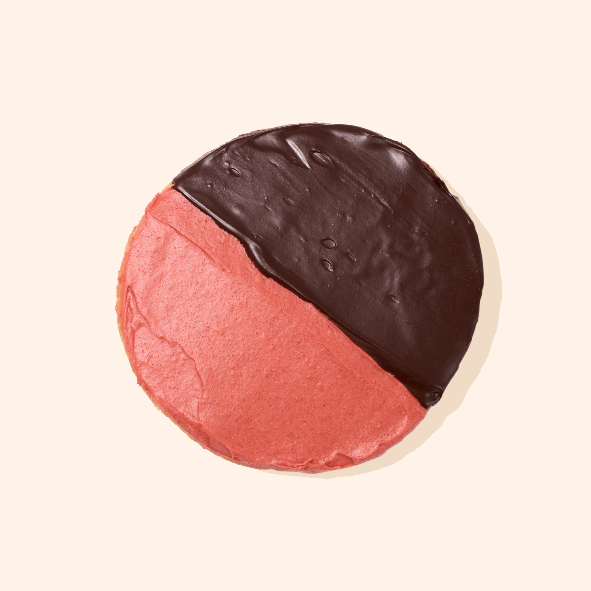Perfect lil sweet treat this Valentine's Day. Our classic B&W is getting the romantic treatment, frosted with a dark chocolate ganache on one half and a strawberry glaze on the other.